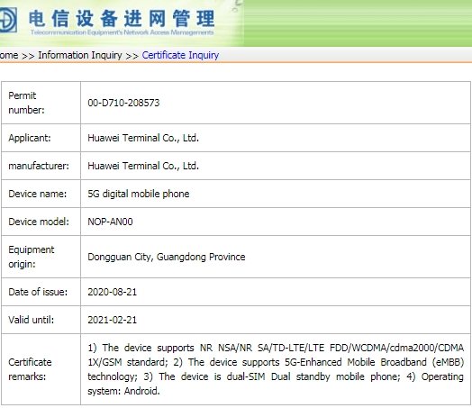 To be precise, the Mate 40 that has a codename of ‘Ocean’ has OCE-AN00 model number. The Mate 40 Pro is codenamed as ‘Noah’ and it has NOH-AN00 model number. The NOP-AN00 could be Mate 40 Pro+ or Porsche Edition. The appearance of the phone at TENAA’s database is a good hint that the arrival of the Mate 40 series is close at hand. However, the full specs are still not known.