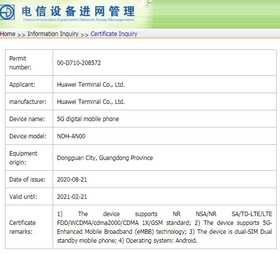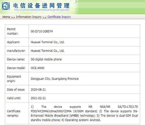 Huawei’s upcoming Mate 40 series smartphones with model numbers OCE-AN00, NOH-AN00, and NOP-AN00 has surfaced in the database of China’s TENAA authority.
