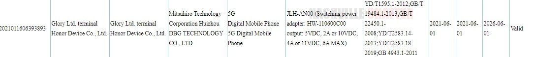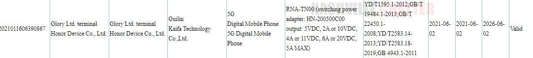 Apart from the JLH-AN00, another phone with RNA-TN00 model number has also received 3C certification. This one is a network variant of the Honor RNA-AN00 phone, which was approved by the 3C authority last month. Since the listing suggests support for a 100W charger, it appears to be a high-end phone from the Honor 50 series. The RNA-AN00/TN00 smartphone has also appeared at TENAA, but its listings are yet to be populated with specs and images.