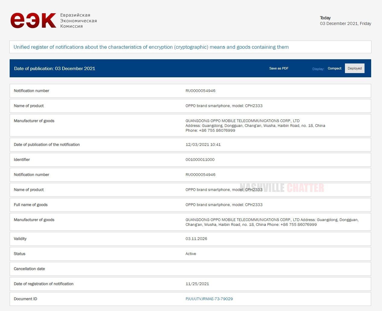 OPPO CPH2333 and CPH2363 smartphones have received certifications from the Eurasian Economic Commission (EEC) authority of China.