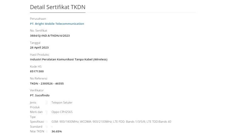 The CPH2531 and CPH2565 have been previously approved by the Eurasian Economic Commission (EEC). The CPH2531 has also been certified by the BIS authority in India. As can be seen in the above screenshots, both CPH2531 and CPH2565 have also been certified by the TKDN regulatory body of Indonesia.