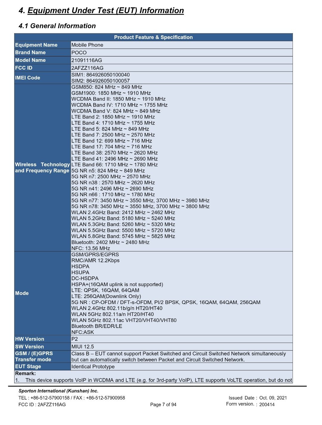 The FCC listing reveals that it will be offered in two storage configurations – 4GB RAM + 64GB storage and 6GB RAM + 128GB storage variants. The phone supports 7 5G bands – n5, n7, n38, n41, n66, n77, and n78. It supports NFC and boots Xiaomi’s MIUI 12.5 custom skin at the top.